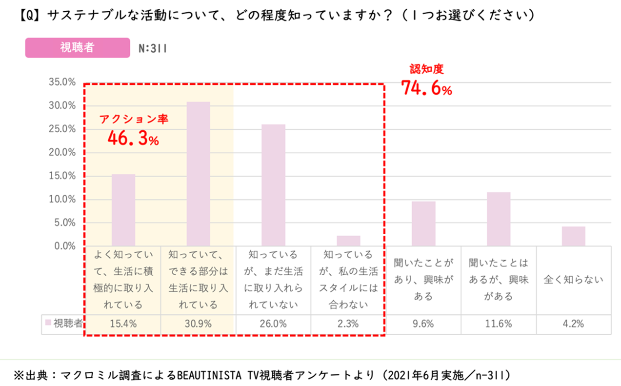 それに伴い独自で実施した調査において、BEAUTINISTA TVユーザーの50%近くがサステナブルな活動を既に生活に取り入れており、更に75%近くがサステナブルな活動に関しての認知があるということが分かりました。