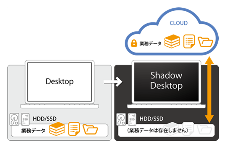 Shadow DesktopはPC紛失時の情報漏洩対策や、リモートワークの生産性向上が総合的に行えるデータレスクライアント製品です。FAT PCにインストールするだけで、操作感を変えずにPCをデータレス化できます。