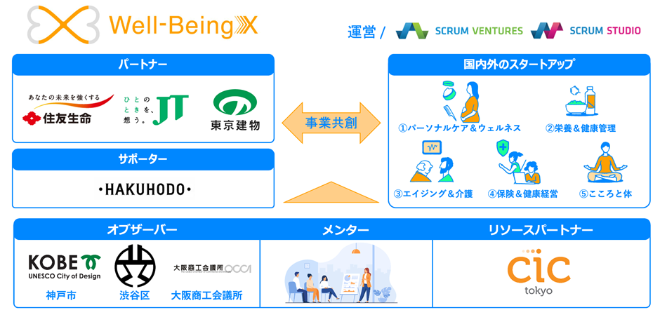 住友生命保険相互会社(取締役 代表執行役社長 高田 幸徳、以下「住友生命」)は、スクラムスタジオ株式会社(代表取締役社長 髙橋 正巳、以下「スクラムスタジオ」)が主催する、一人ひとりのニーズに応じた「多様なウェルビーイング(Well-being※1)の実現」をテーマに、世界中のスタートアップと連携・事業共創を行うグローバル・オープンイノベーション・プログラム「Well-BeingX※2」(以下「本プログラム」)に参画しました。