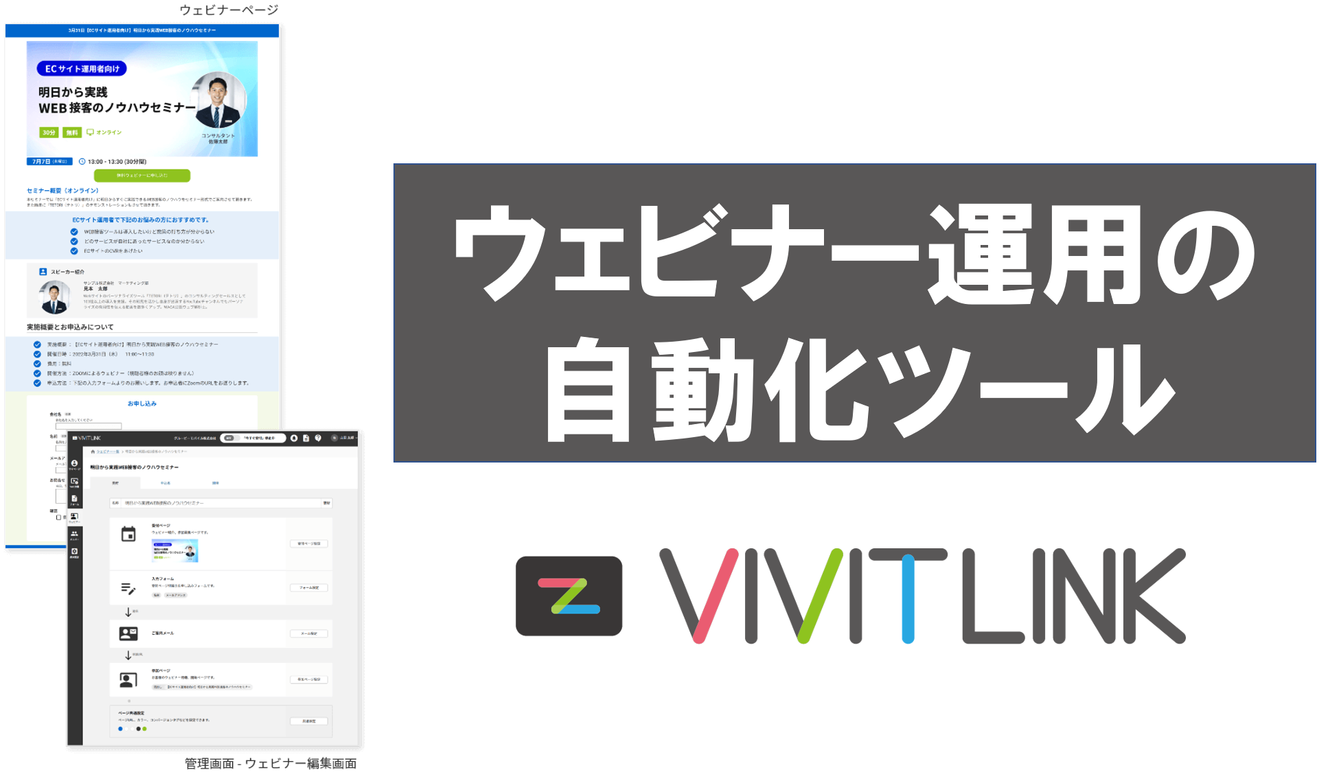 VIVIT LINK(ビビットリンク)は、ウェビナー(オンラインセミナー)の運用やオンライン商談の日程調整などオンラインビデオツールを利用したマーケティング、セールス活動を自動化するツールです。