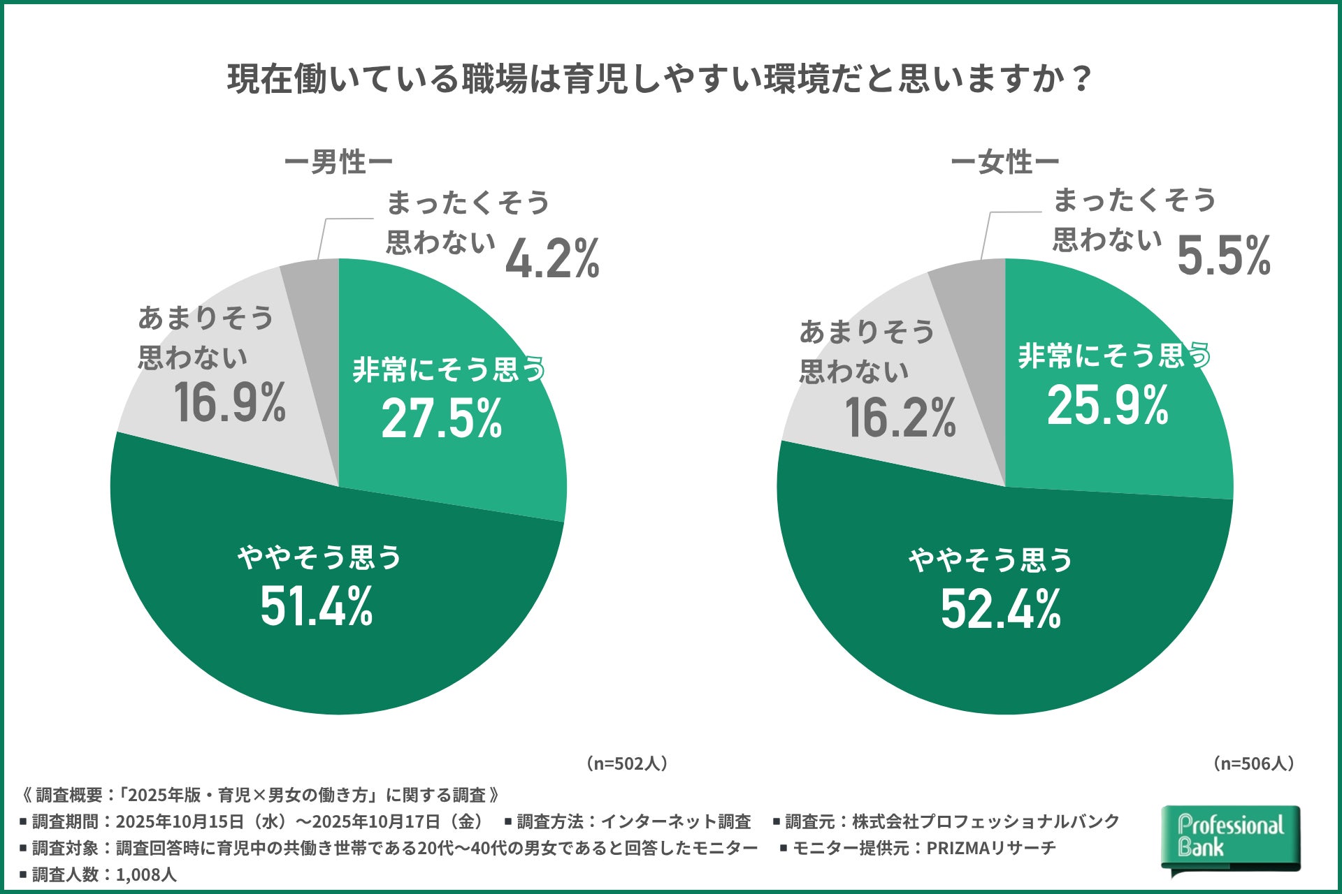 職場環境の改善も進み、「育児しやすい」と感じる方が男女ともに約8割となりました。