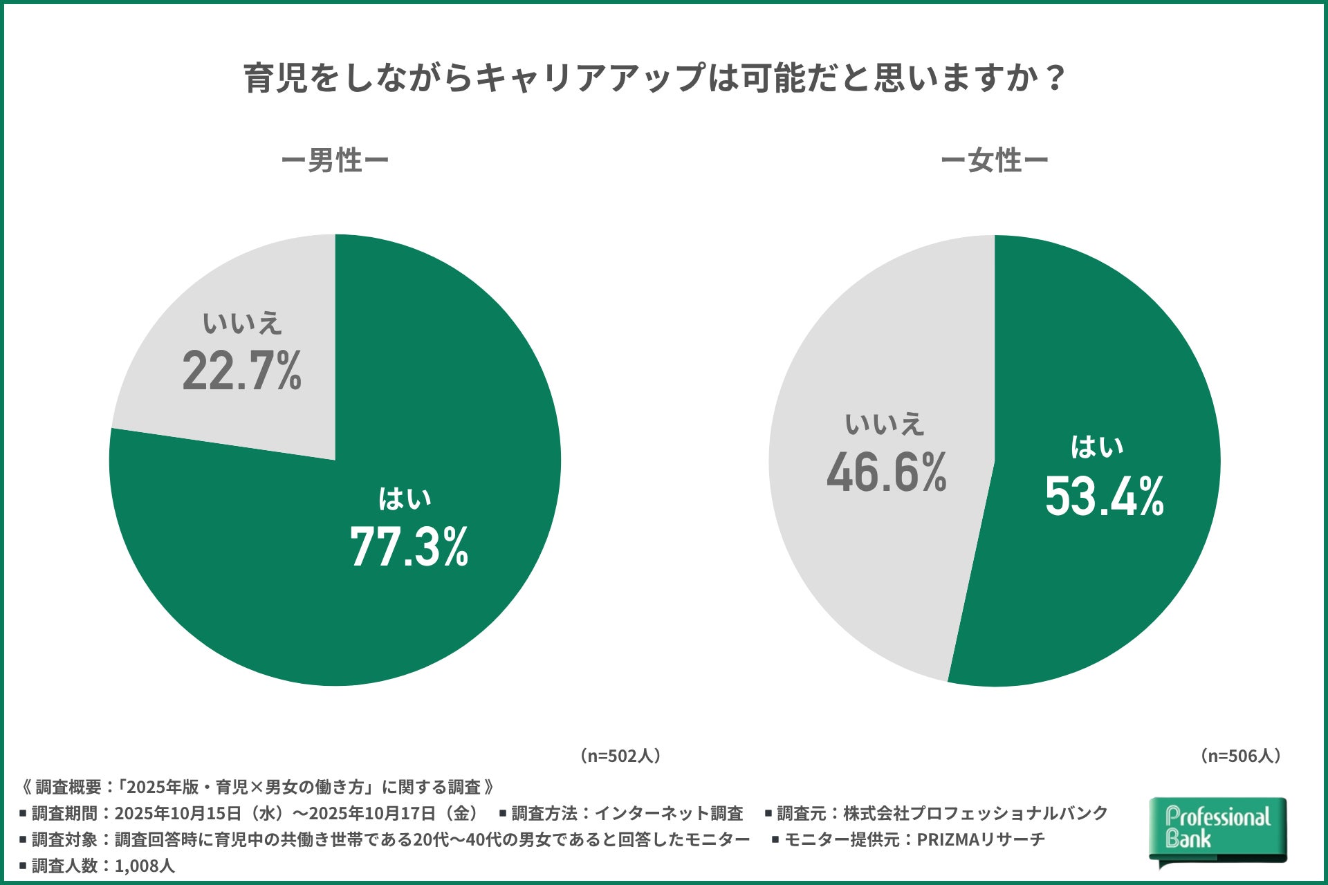 また、「育児をしながらキャリアアップは可能だと思うか」を尋ねたところ、男性の約8割が『はい(77.3%)』、女性の約半数が『はい(53.4%)』と回答しました。