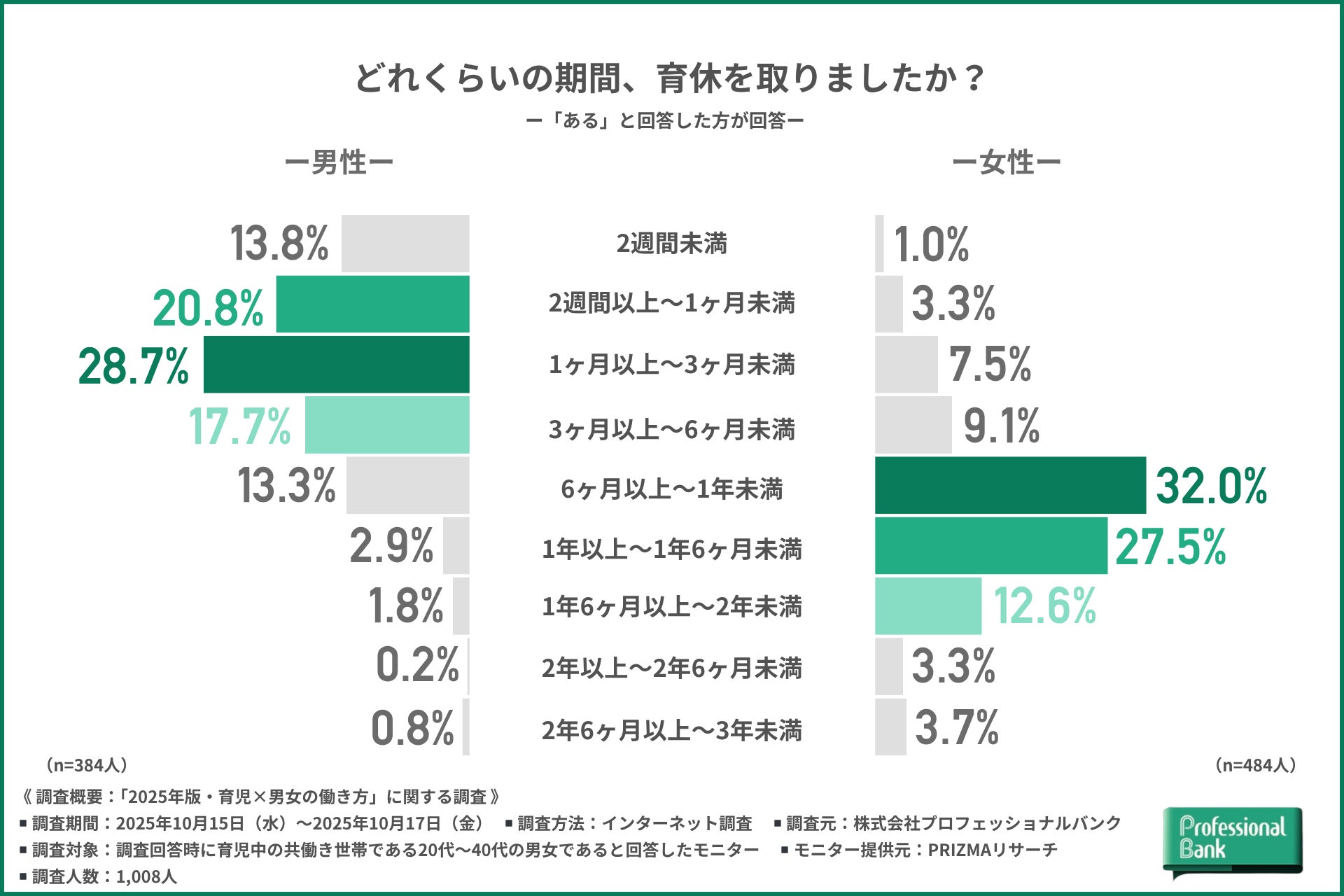 続いて、「育休を取得した期間」を聞いたところ、男性は『1ヶ月以上~3ヶ月未満(28.7%)』が最も多く、『2週間以上~1ヶ月未満(20.8%)』『3ヶ月以上〜6ヶ月未満(17.7%)』と続きます。