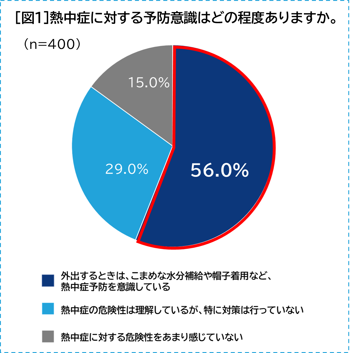 今回行った「熱中症対策に関する意識調査」において、熱中症に対する予防意識がどの程度あるか調査したところ、約6割(56.0%)の人が「外出するときは、こまめな水分補給や帽子着用など、熱中症予防を意識している」と回答しました[図1]。