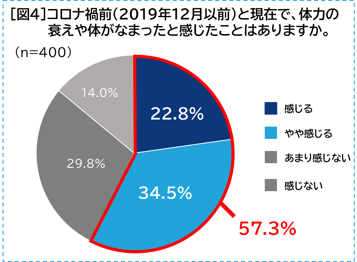 また、コロナ禍前と現在で、体力の衰えや体がなまったと感じたことがあるか聞いたところ、約6割(57.3%)の人が「感じる」(感じる+やや感じる)と回答しました[図4]。