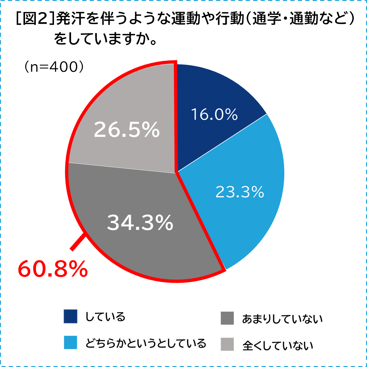普段の生活における発汗を伴うような運動や行動(通学・通勤など)の有無について調査したところ、6割以上(60.8%)の人が、「していない」(全くしていない+あまりしていない)と回答しました[図2]。
