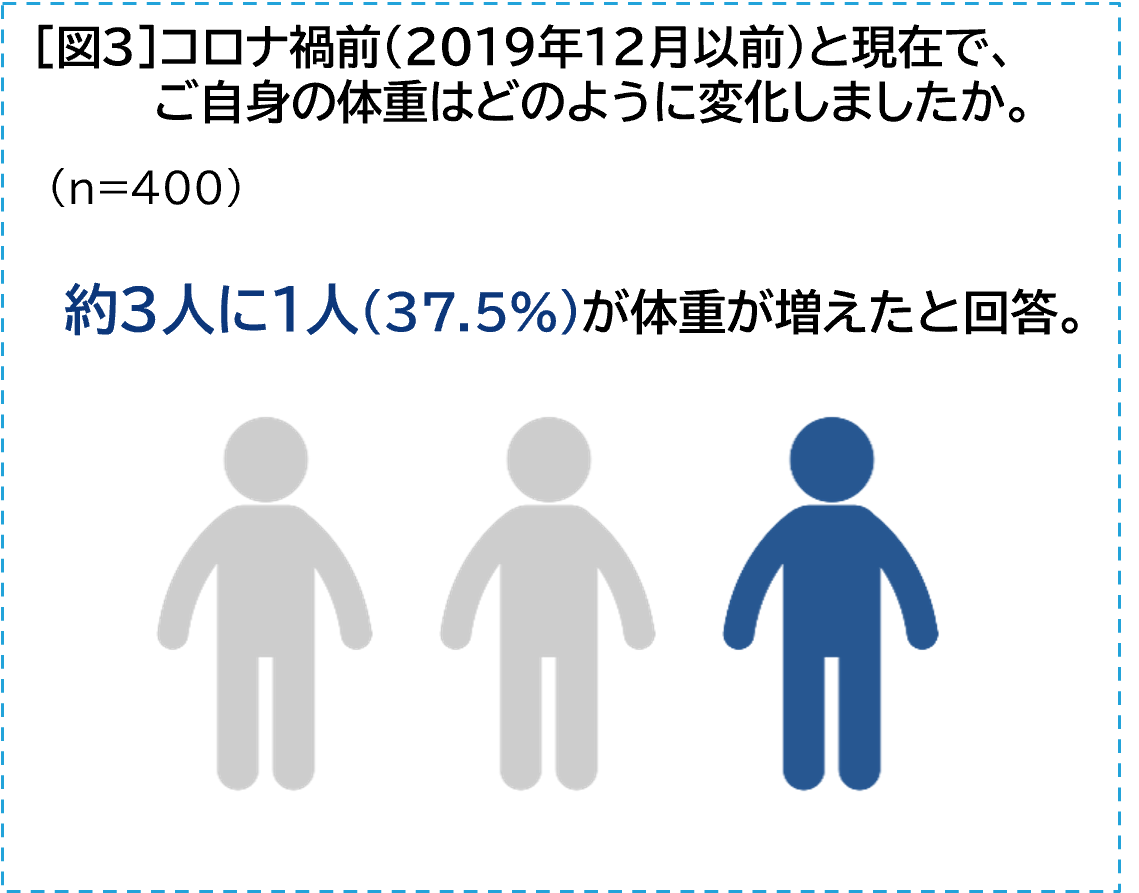 コロナ禍前(2019年12月以前)と現在の、自身の体重変化について調査したところ、約3人に1人(37.5%)が体重が「増加した」(非常に増加した+やや増加した)と回答しました[図3]。