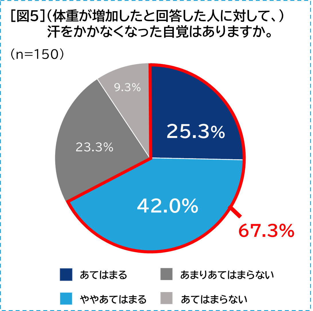 体重増加した人が汗をかかなくなった自覚があるかどうかを調査したところ、約7割(67.3%)の人が「あてはまる」(あてはまる+ややあてはまる)と回答しました[図5]。