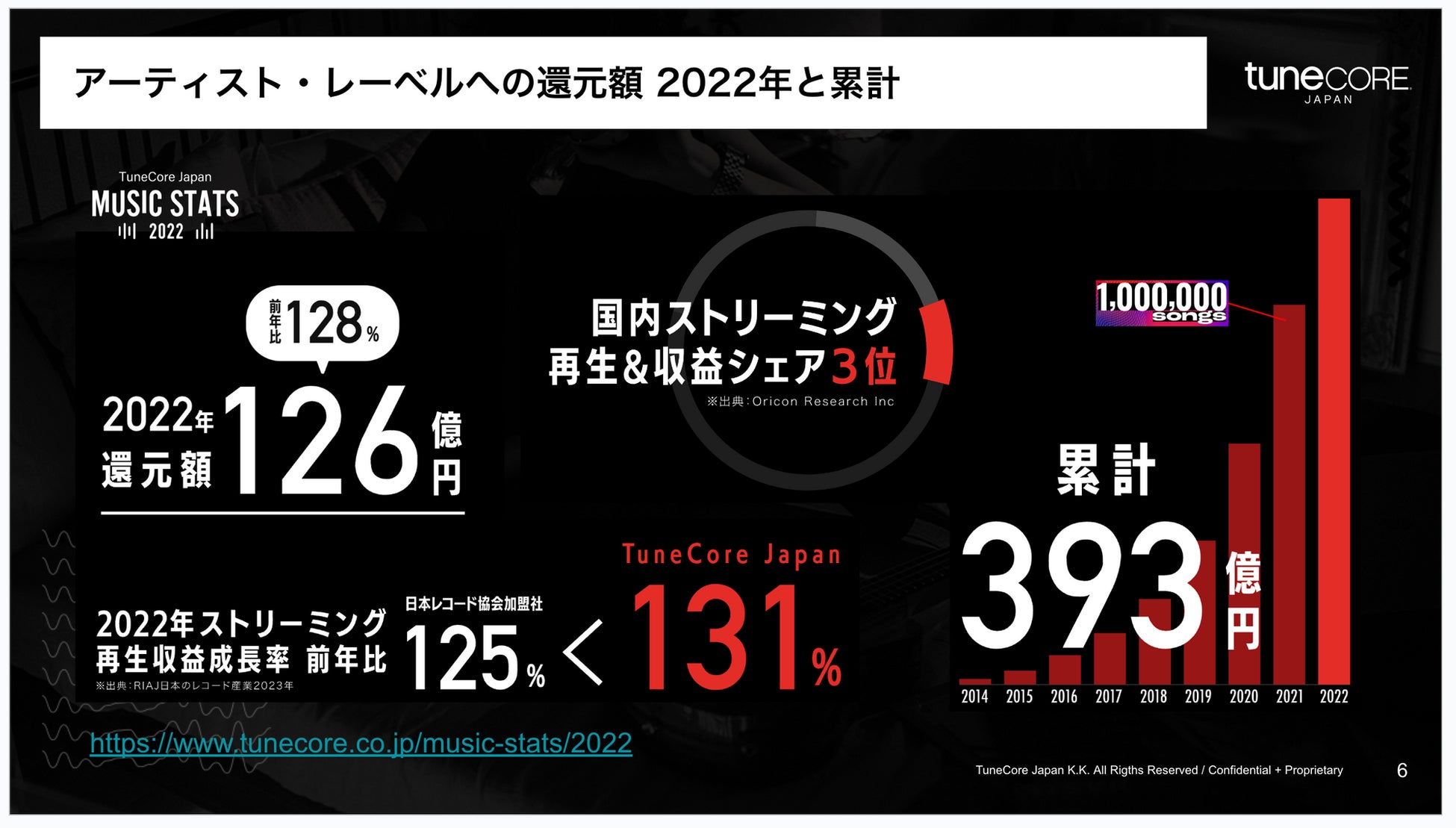 2022年度のアーティストへの還元額は約126億円(前年比128%)となり、2012年のサービス開始以来、累積の還元総額は393億円となりました。TuneCore Japanの2022年の統計数値、新機能、その他詳細に関しては下記の【MUSIC STATS 2022】をご覧ください。