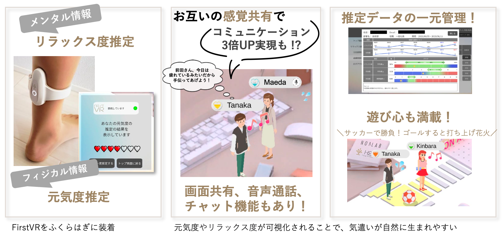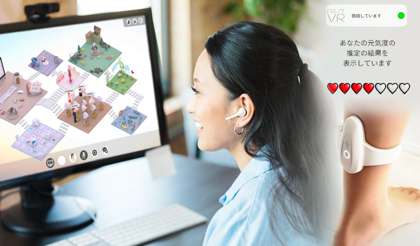H2L独自の技術である、世界初の筋変位センサデバイスFirstVR※5を脹脛(ふくらはぎ)に装着することで、筋変位データからユーザの「元気度」や「リラックス度」を推定。メンタルとフィジカル両方の感覚をメタバースオフィス内のアバターに自動反映させます。感覚をアバターで共有することを通じて、コミュニケーションの向上、セルフメディケーションに加えて業務改善が期待できます。