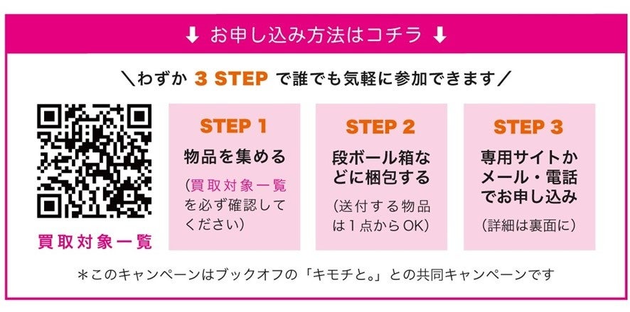 参加方法はわずか3STEP!①物品を集め、②段ボール箱などに梱包し、③専用サイトかメール、電話で申し込むだけ。宅配業者がご自宅やオフィスまで集荷に伺った後、ブックオフが査定した買取金額+10%(ブックオフご協力分)がJCVに寄付され、感染症を予防するためのワクチンや関連機器が途上国の子どもたちに贈られます。送料無料のこのキャンペーンは、個人に限らず、SDGsを推進する企業や団体さまもご活用いただけます。