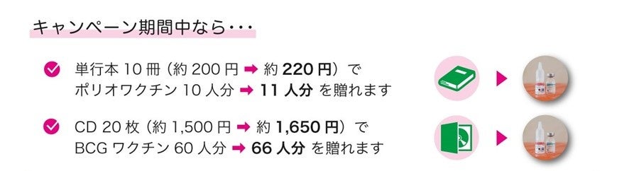 本キャンペーンでは、家、会社や学校に眠っている、使われていないものを「キモチと。」を通して送料無料で送ると、ブックオフが買い取り、買取額にブックオフご協力分の10%が上乗せされた金額が、途上国の子どもたちへのワクチン支援となります。買取対象は、定番の本やCD・DVD・Blue-rayからPC、スマホ、楽器に至るまで、30品目以上です。