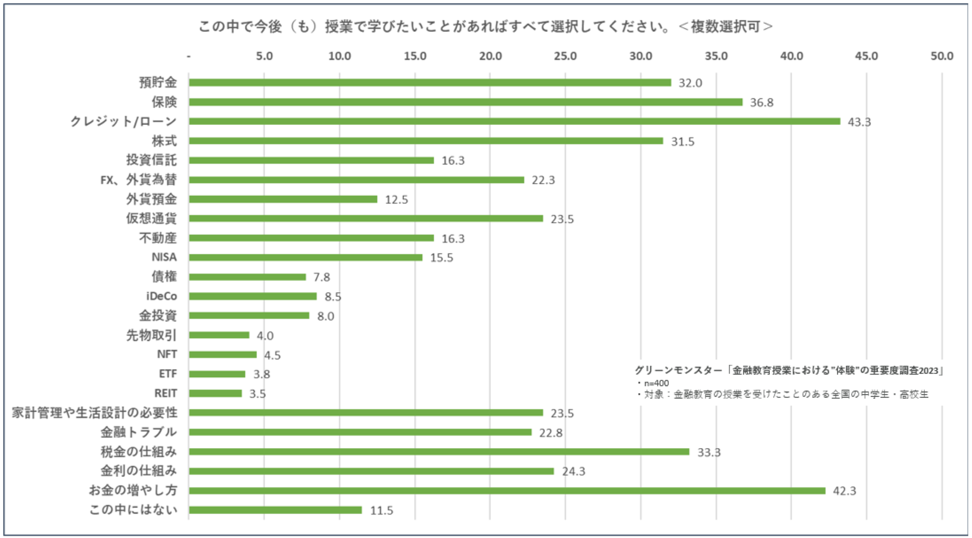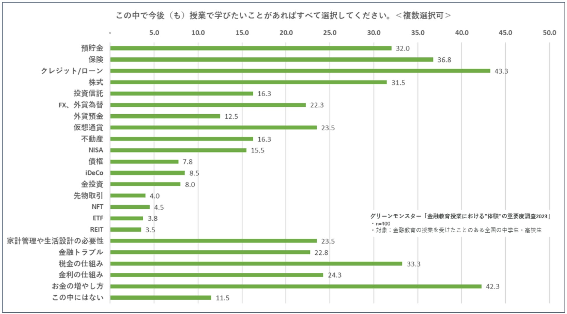 グリーンモンスター株式会社 (本社:東京都渋谷区 代表取締役:小川亮、以下「グリーンモンスター」)は、高校での金融教育開始から2年目を迎え、全国の中学生・高校生400名を対象に、「金融教育授業に関するアンケート調査」を実施いたしましたので、結果を報告します。