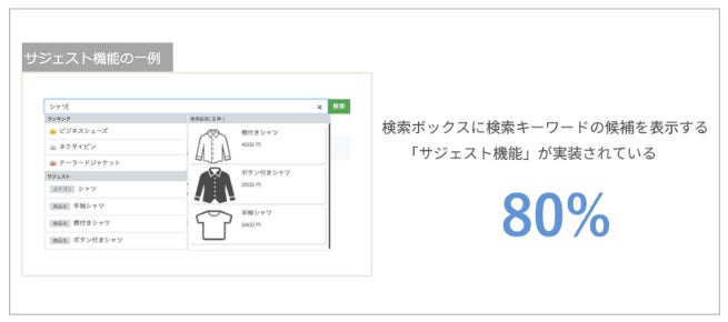 80%に検索ボックスに検索キーワードの候補を表⽰する「サジェスト機能」が実装されていました。