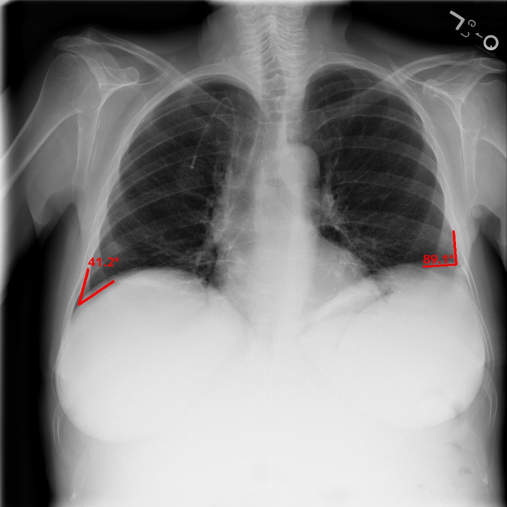 肺野境界の点のうち横隔膜と肋骨が交差する点とその点から一定の距離にある肺野境界線上の2点とのなす角[°]の計測を行い、計測結果が基準値を超えた場合に表示します。