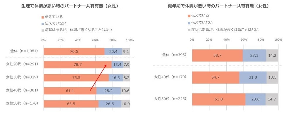 生理で体調が悪い時、夫に「伝えている」と回答した女性の割合は70.5%。年代別でみると夫に伝える割合は若年層ほど高まる傾向にあります。