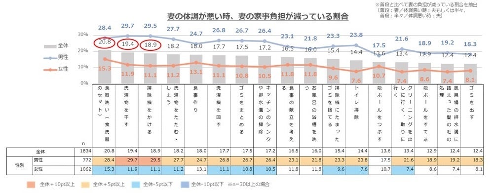 妻が生理や更年期の症状で体調が悪い日に、普段と比べて妻の負担が減っている(=夫もしくは半々で行っている)家事は、全体で「食器洗い」が20.8%ともっとも高く、次いで「洗濯物を干す」が19.4%、「掃除機をかける」が18.9%と続きました。