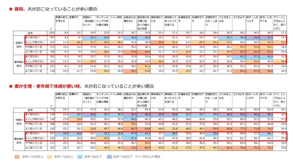 これらのことから、女性の不調を理解している男性ほど家事を積極的に行う傾向にあり、妻をサポートしたいという気持ちがより強くあらわれているといえそうです。