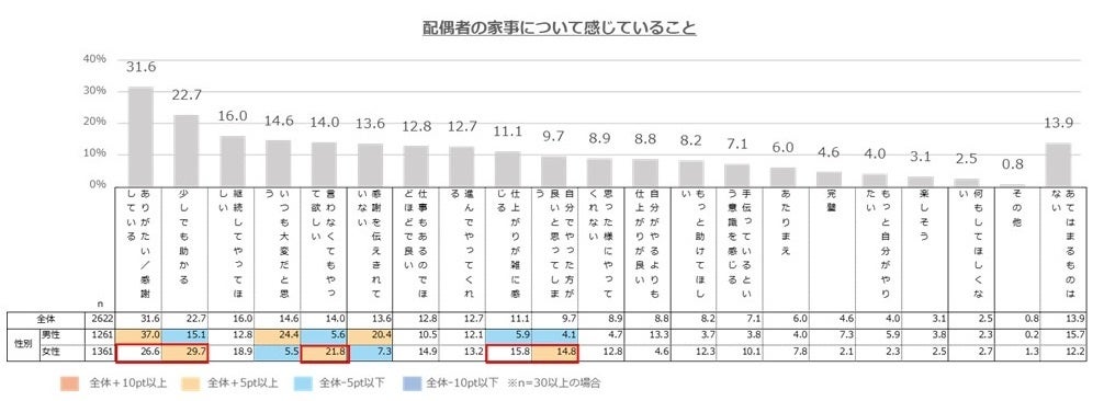 さらに配偶者の家事について感じていることについて、女性は「少しでも助かる」「ありがたい/感謝している」が高い一方、「言わなくてもやって欲しい」も21.8%と高く、少なからず夫が行う家事について不満を持っている人がいることも見て取れました。
