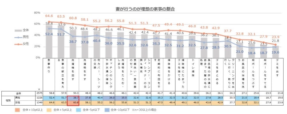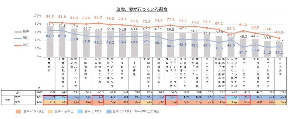 その一方「段ボールをつぶす」「シャンプー・コンディショナーの補充・交換」「洗濯物をたたむ・しまう」は特に男女差が大きく、男性は妻が行っているという認識が低い傾向に。特に日常の雑務に近い家事の場合、男性は自分が行なっているという意識が強くなる傾向があると読み取れます。