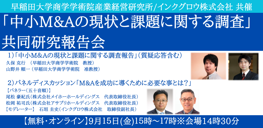 【9/15(金)15時~特別講演・見逃し配信有】 早稲田大学・インクグロウ共同研究報告会!日本初*「中小M&Aの現状と課題に関する調査」