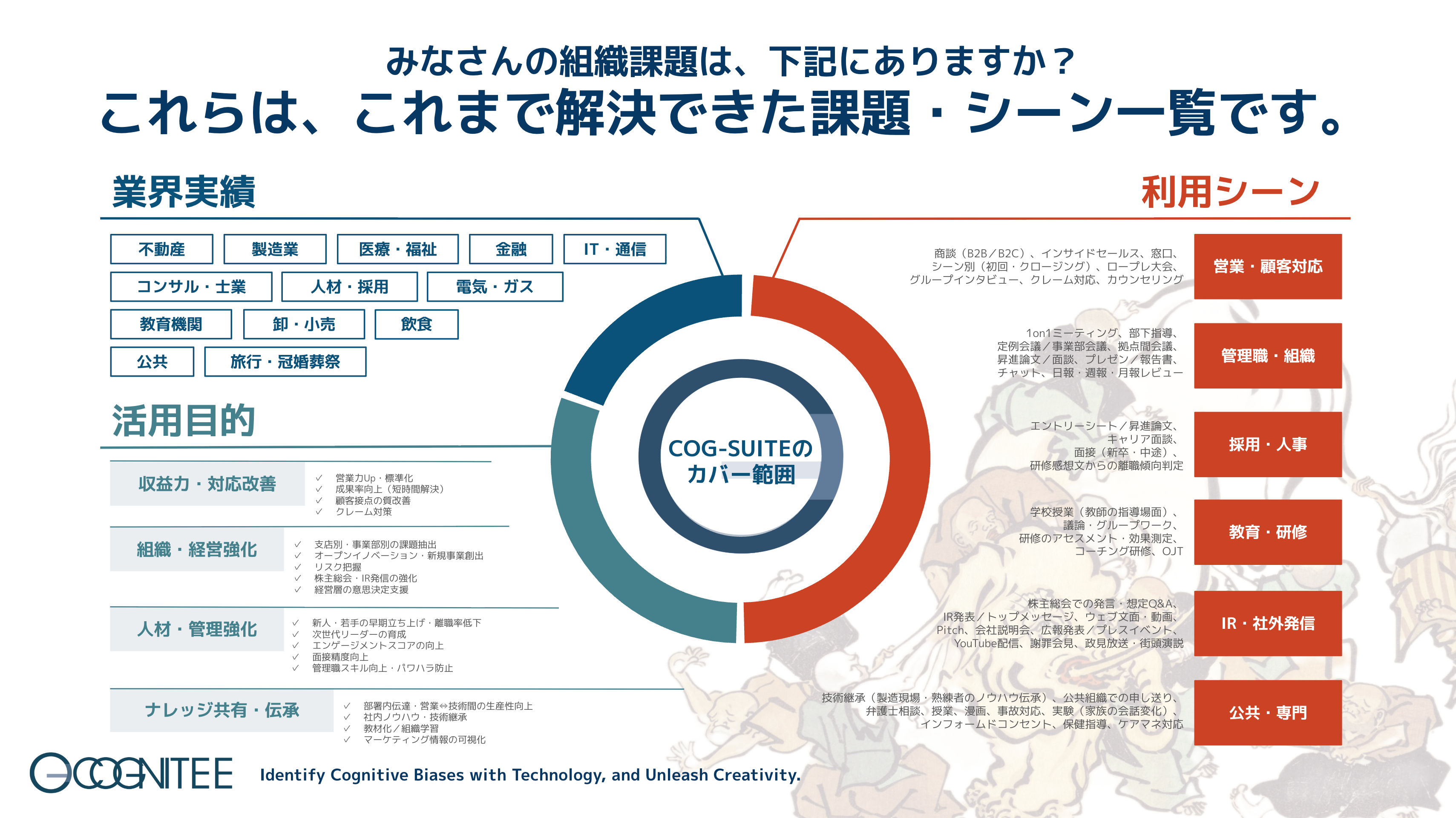 コグニティは「技術の力で、思考バイアスなき社会を。」というパーパスの下、人の思考がもたらす限界としてのバイアス(思い込み・勘と経験での判断)を無くしていくための技術とサービスを展開しています。