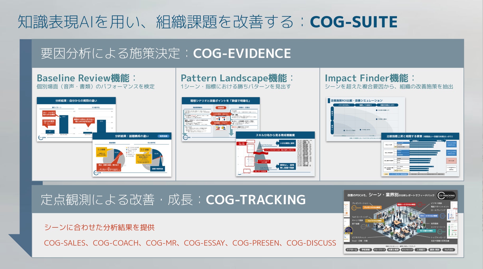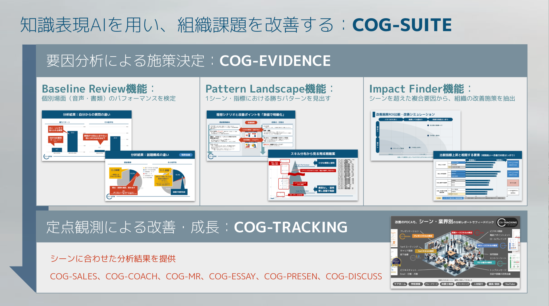 今回のBaseline Review機能は、組織内の成長・改善を感覚の判断ではなく、客観的なデータを下に判断していくための経営層・管理職向けサービスCOG-EVIDENCE(60万円+税〜)から一部機能を切り出したものです。この利用をきっかけとし、Pattern Landscape/Impact Finderを含むCOG-EVIDENCE全体の利用へ段階的に接続し、組織課題の特定から改善施策の抽出まで一貫して支援していきます。あわせて、専門家と連携したPDCAサイクル構築(パートナープログラム)も順次発表予定です。