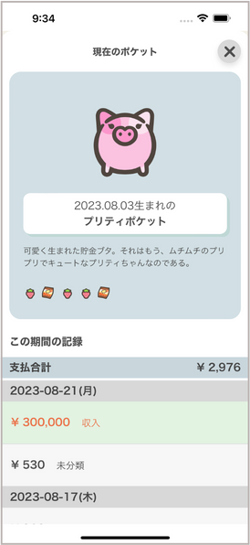 育て上げたキャラクターとともに、その期間につけた家計簿のデータも振り返ることができるため、直近の家計簿の振り返りにも役立てることができます。
