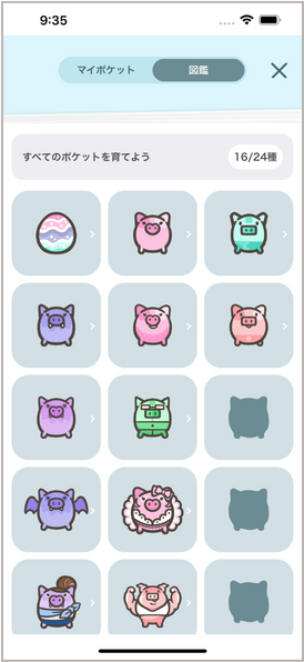 全24種類の中で、今まで育てたキャラクターを閲覧できる機能です。