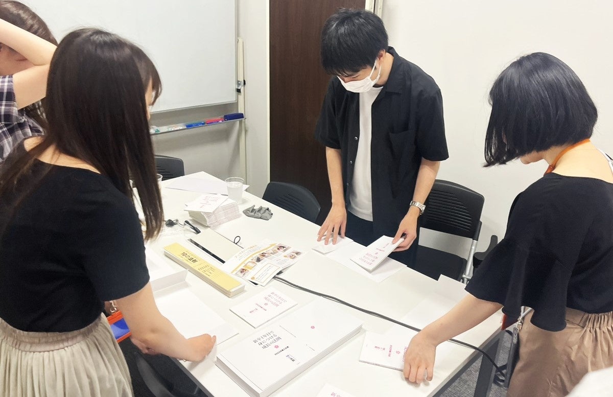 写真=執筆した社員たち。7月13日、印刷会社から届いた本の表紙に帯を付け、後輩に配りました。