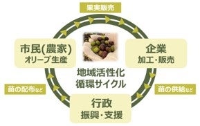 広島県の島々が抱えるいくつかの課題をオリーブ栽培によって解決する活動。行政が市民にオリーブ苗の助成配布を行い、市民が育てて、企業が果実を買い取り販売する仕組みで、オリーブの循環サイクルは機能しています。