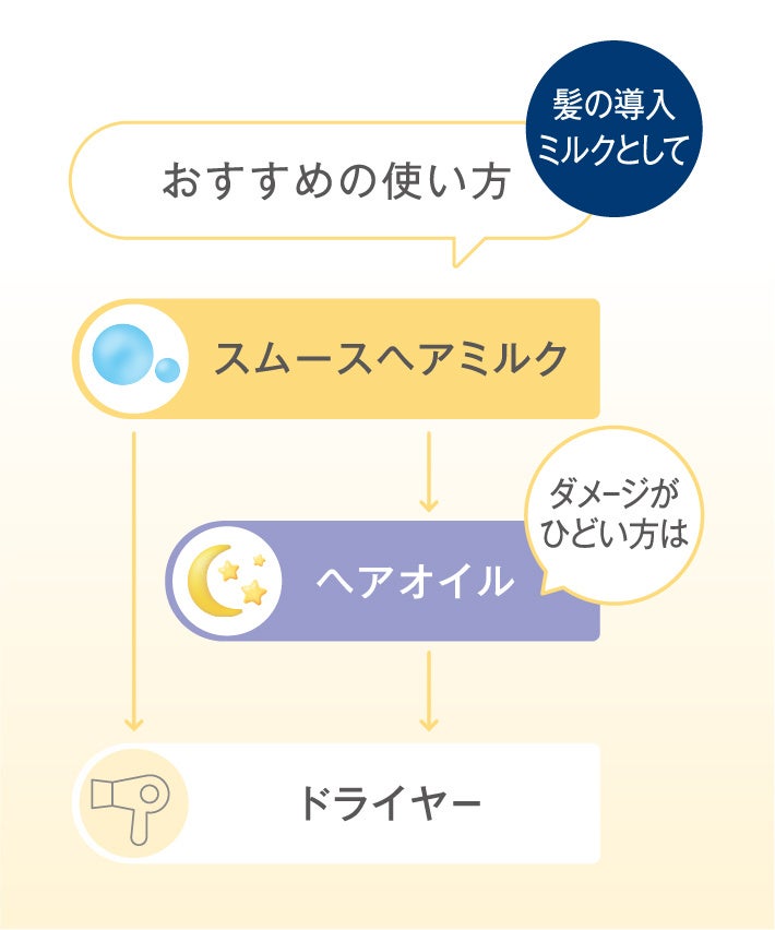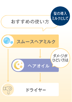 タオルドライ後水気を切り、適量をパサつきのきになる箇所を中心になじませてご使用ください。ダメージが気になる方は、さらにお手持ちのヘアオイルをご使用ください。
