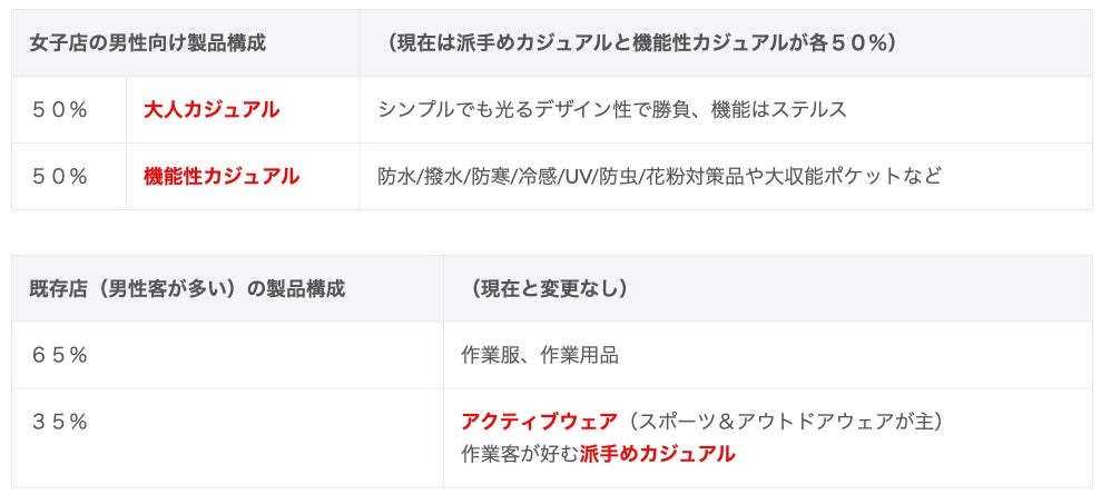 従来は女子店の男性製品は作業服のノウハウが活かせるアクティブウェアが主力で、既存店との製品の「共通化」にこだわってきました。今後は女子店の多くのお客様とインフルエンサーの声に応えて、男性用アイテムの半分を女子店の専売製品である「大人カジュアル」に転換することにしました。①女子都心店で鍛えられたデザイン性の良さ ②「大人カジュアル」にも機能格付けを導入し、機能を分かりやすくする ③他社の追随が難しいレベルの低価格 の3点セットで男性アパレルの主力市場でも独自の地位を築きます。