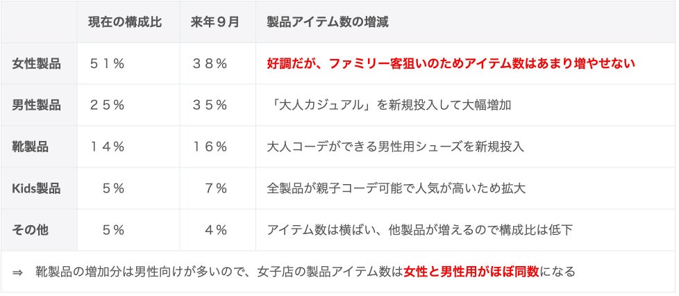 新規投入する男性用の「大人カジュアル」は女子店の専売製品です。女性アイテムの専売製品比率は現在 50%ですが、今後も拡大を続けます。これにより、女子店と既存店が更に差別化されます。本年9月から女子店は地方で路面店の出店攻勢をかけますが、専売製品の増加により周辺既存店への負の影響が大幅に緩和されます。女子店と既存店の男性向け製品構成は来年9月には下記になります: