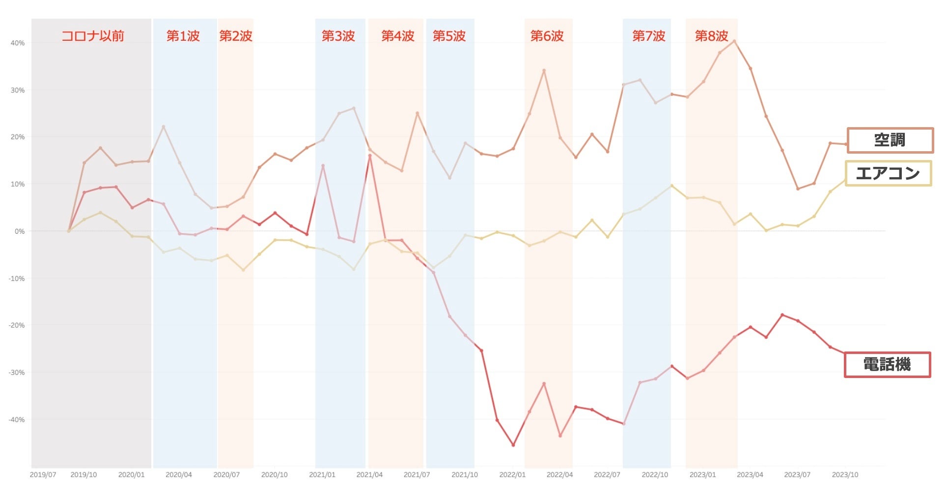 ■コロナ以前から価格上昇率の低かった家電カテゴリ調査。低かったのは「電話機」「エアコン」「空調」