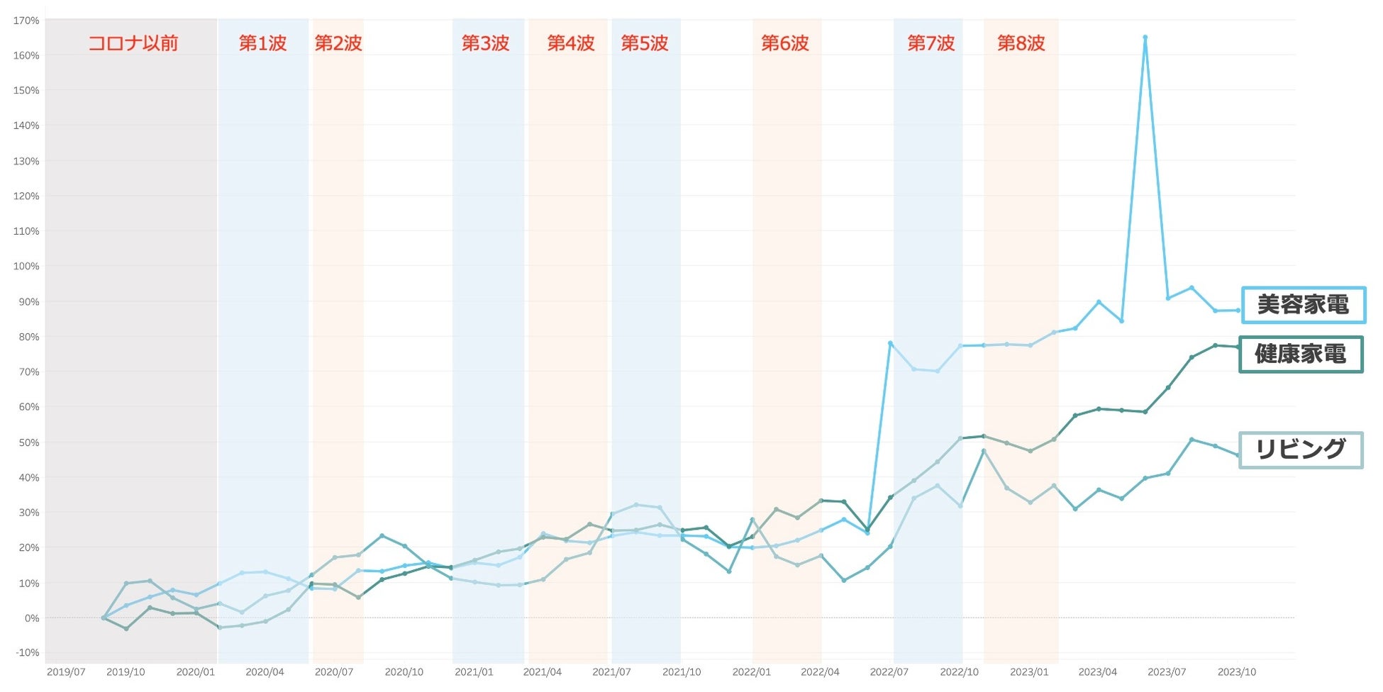 コロナ以前からコロナ第1〜8波を通し現在に至る2019年8月から2023年10月までで、価格上昇率の高かった主な家電カテゴリは「美容家電:約190% ※2019年8月を起点とし2023年10月時点での価格上昇率」「健康家電:約180%」「リビング家電:約150%」という結果でした。いずれのカテゴリも2022年6月からの上昇率が高くなっています。