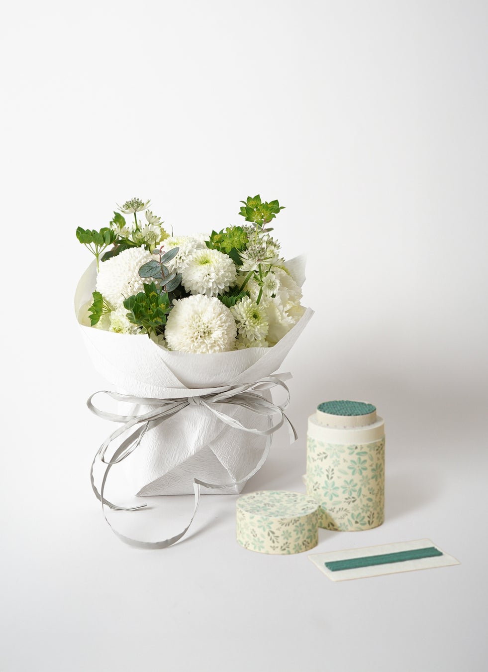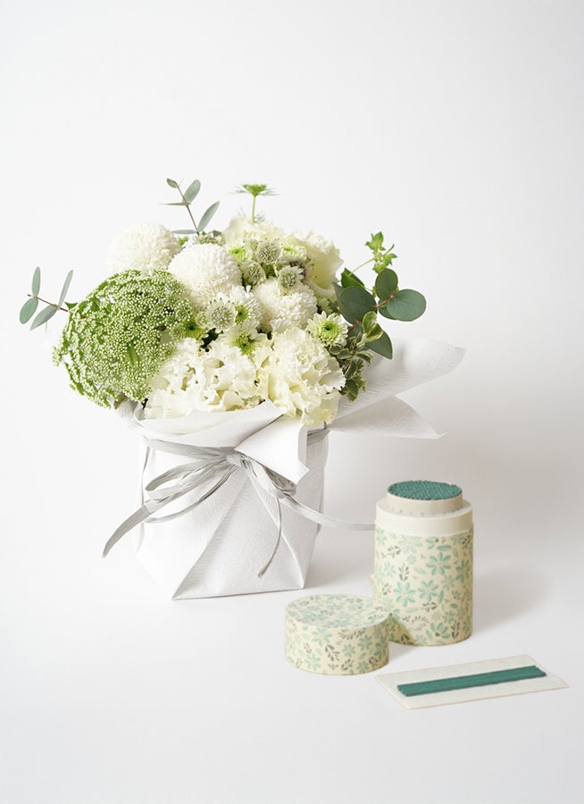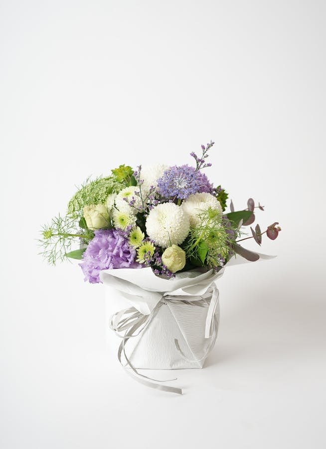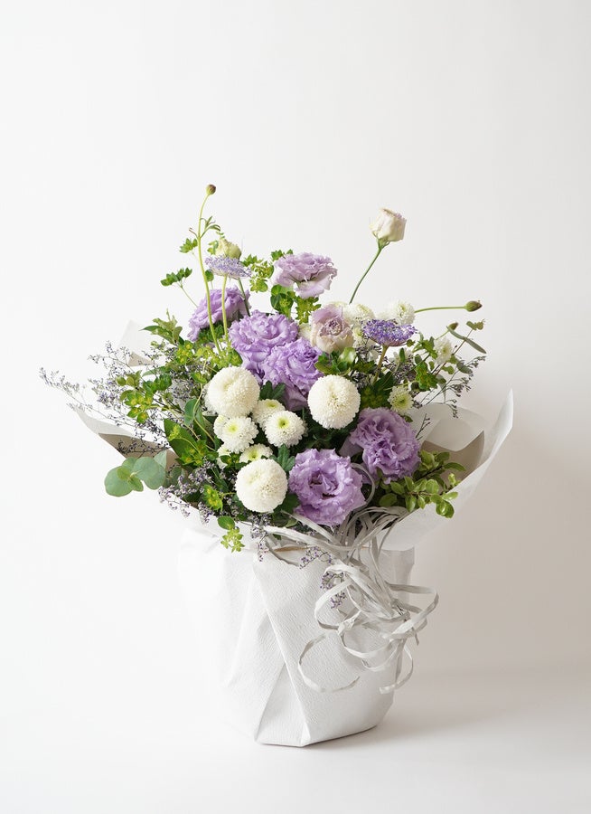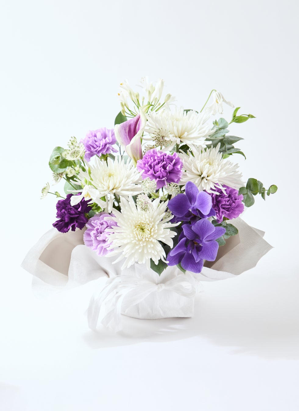 仏壇や盆棚にそっと彩りを添える、現代的なお盆用アレンジメントを豊富にご用意しました。落ち着いた白を基調としたものから、やさしいパープルをあしらったものまで、サイズも幅広く取り揃えております。和紙のラッピングつきで、格式あるシーンにも最適です。
