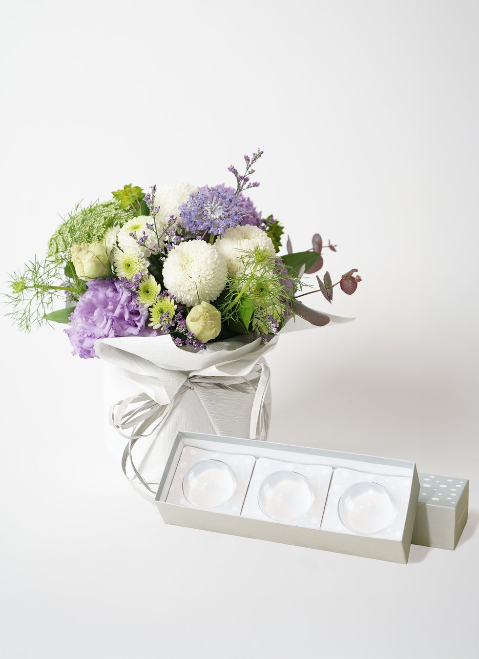 都松庵 水玉もち3個入りとお供え花 アレンジメント パープル M 8,328円税込