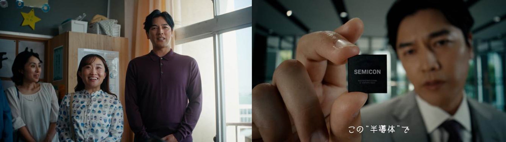 今回要さんには、マクニカのビジネスのど真ん中、半導体事業の営業の役を演じてもらいました。半導体チップをつまんで英語で商談をスマートにこなす商社マン姿と、娘を前にすると目尻が下がってしまうパパの顔のギャップに注目です。実は、撮影中に横でキンタロー。さんがちょこちょこ変顔していたそうで、カットがかかったら吹き出してしまうシーンも。そのせいか、親子のカットはすごく自然で、本当の親子のようでした。