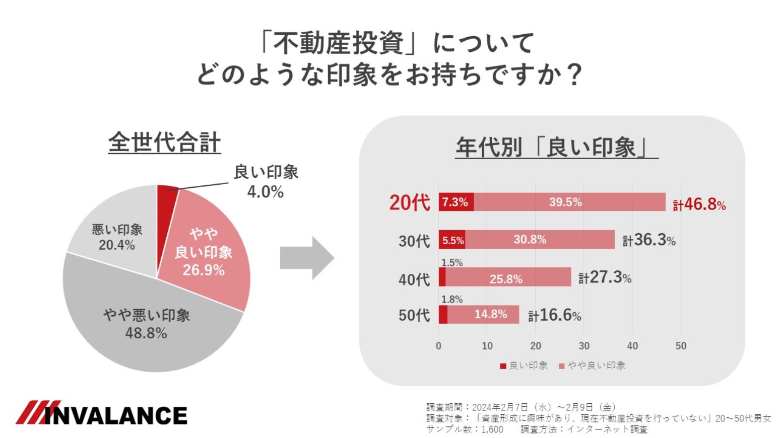 株式会社インヴァランス(本社:東京都渋谷区代々木、代表取締役:高橋由崇、以下「インヴァランス」)は、「資産形成に興味があり、現在不動産投資を行っていない」20〜50代の男女 1,600 名を対象に「不動産投資のイメージ」に関する調査を実施いたしました。