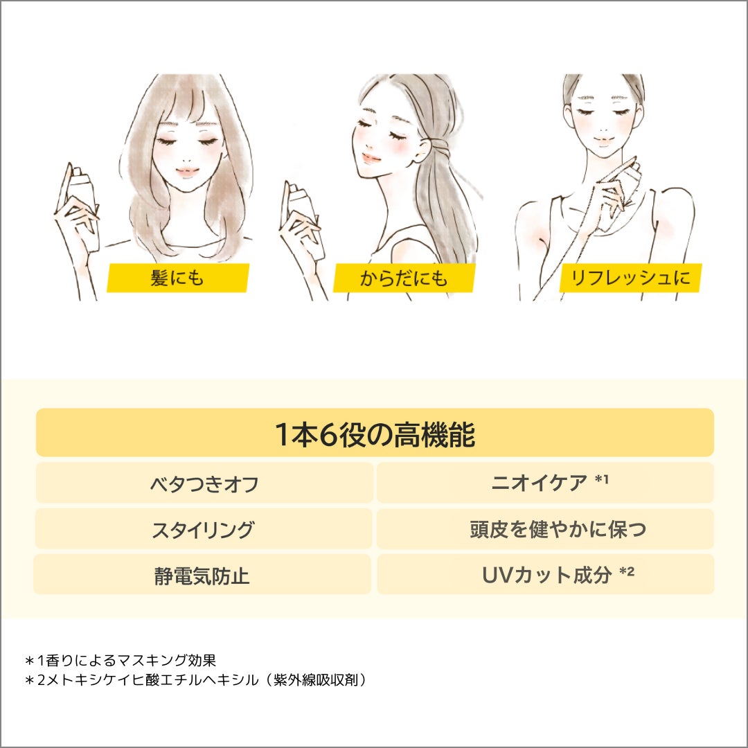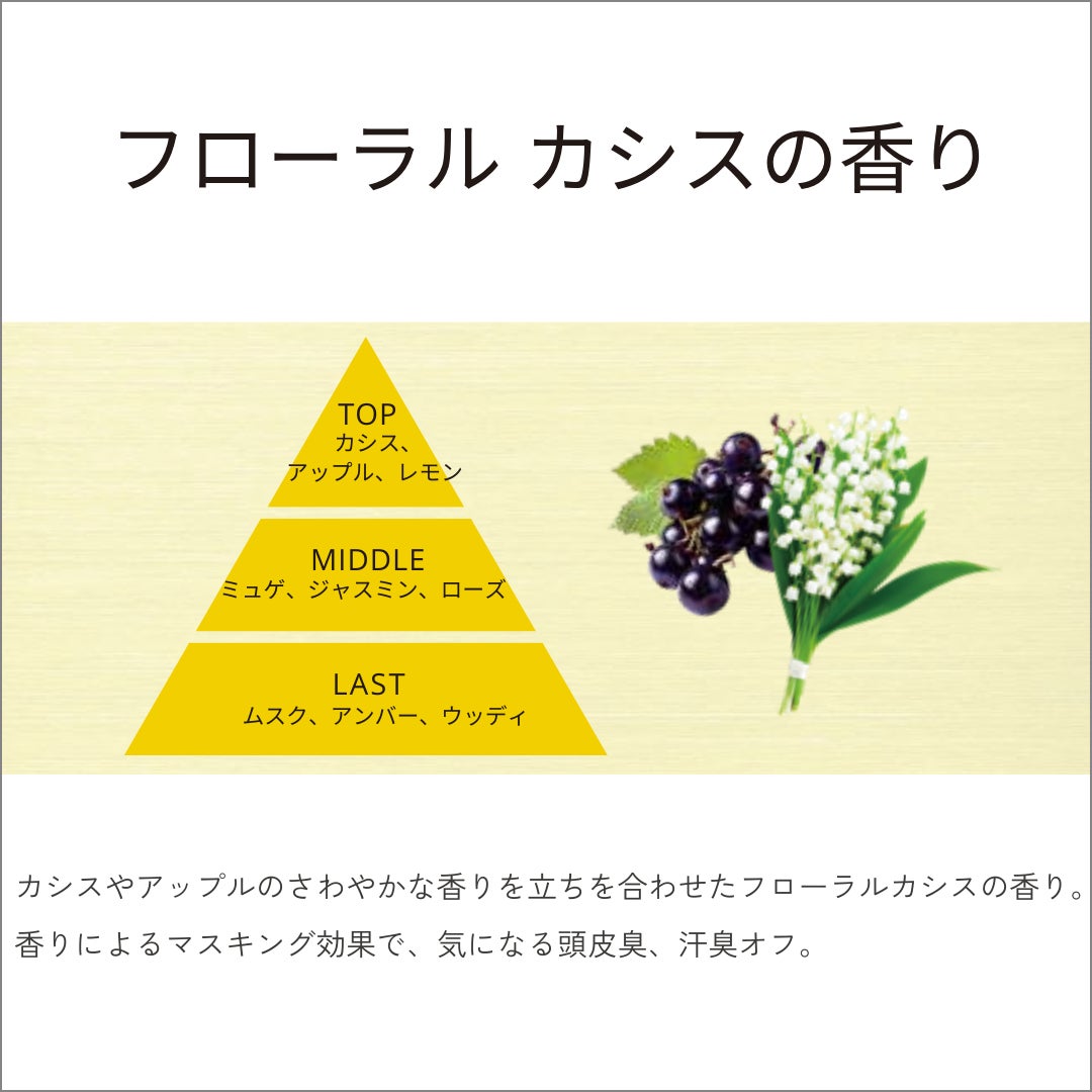 超高圧*¹浸透型リペアビタミンC誘導体*²を配合の皮脂吸着微粒子パウダー*³がベタつき・余分な皮脂を吸着。フローラルカシスの香りですっきりリフレッシュしながら全身をさらさらに整えます。また、香りによるマスキング効果で気になる頭皮臭や汗臭もしっかりオフ*⁴。