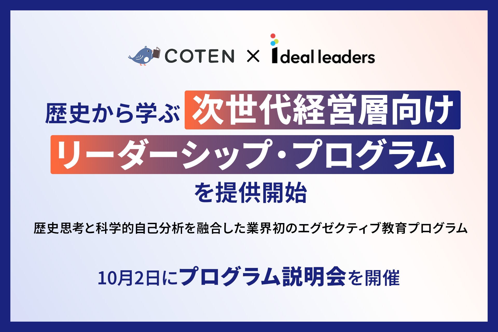 アイディール・リーダーズ株式会社(本社:東京都千代田区、代表取締役:永井恒男、以下「Ideal Leaders」)は、Podcast『コテンラジオ』で知られる株式会社COTEN(本社:福岡県、代表取締役CEO:深井龍之介、以下「COTEN」)と協業し、次世代経営層向けの革新的リーダーシップ開発プログラム『歴史から学ぶ次世代経営層向けリーダーシップ・プログラム』の提供を2025年10月より開始いたします。