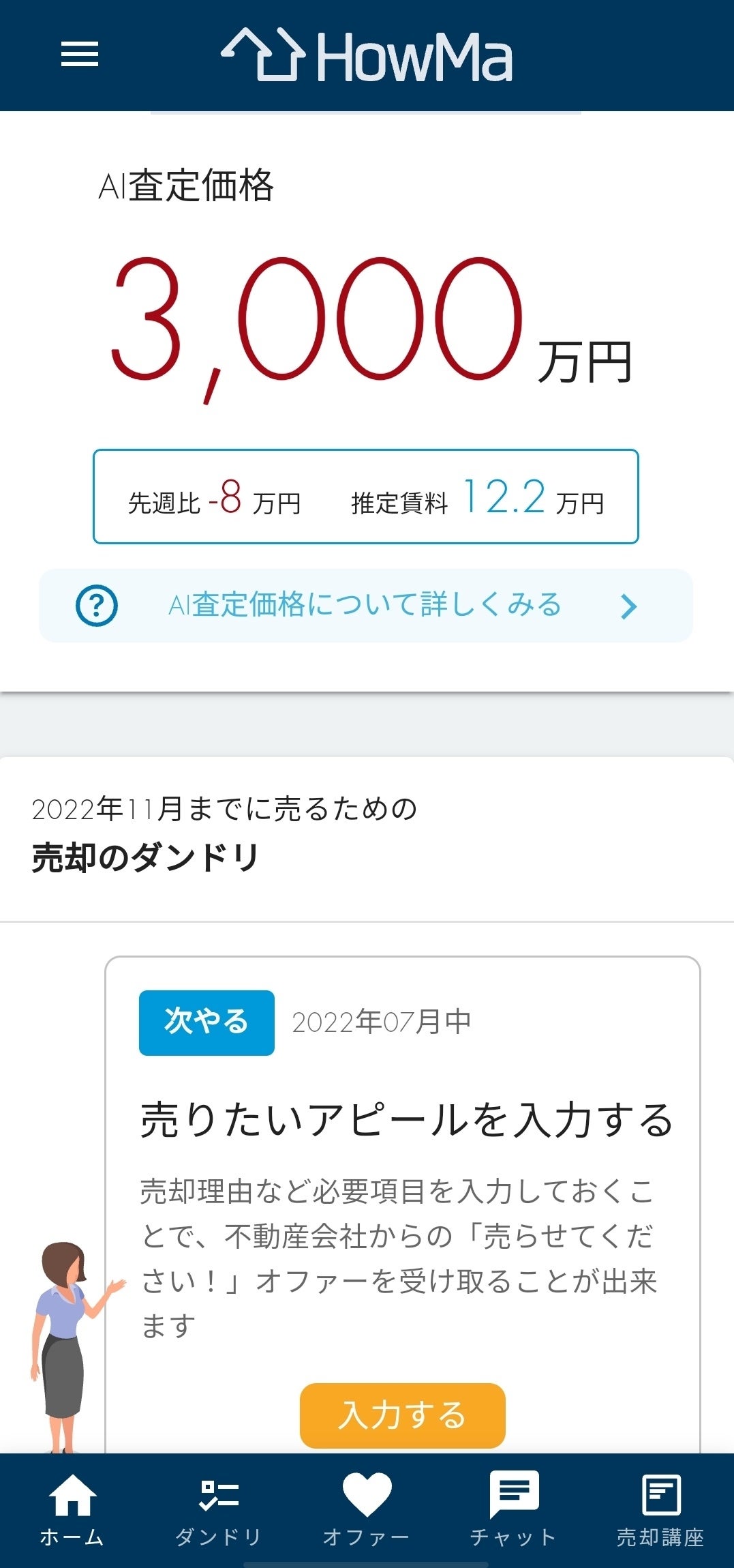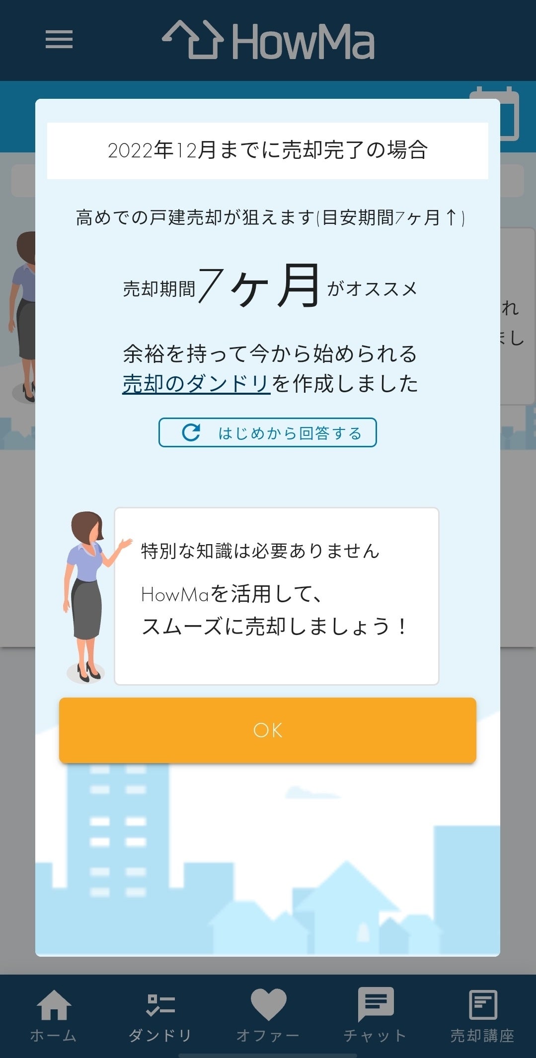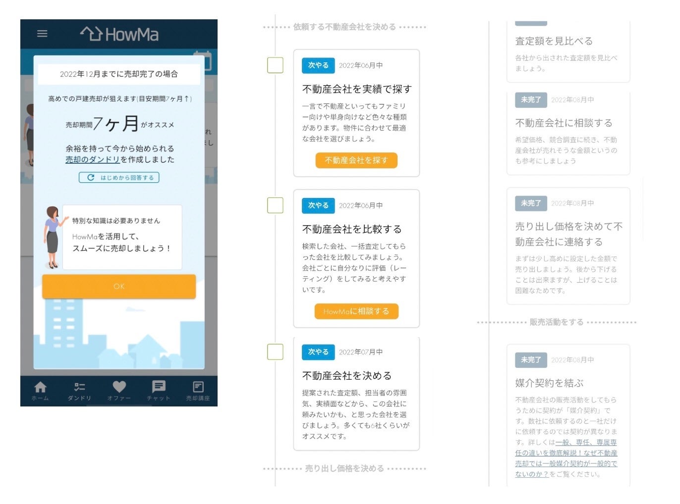 不動産売却の成功に必要な情報を、必要なタイミングでHowMa内で提示・メールでお知らせします。その他、売却活動で疑問や不安がある際は、不動産仲介のキャリアが豊富な相談員「HowMaコンシェルジュ」にチャットで相談できるので、不動産売却の経験や知識がない方でも安心です。