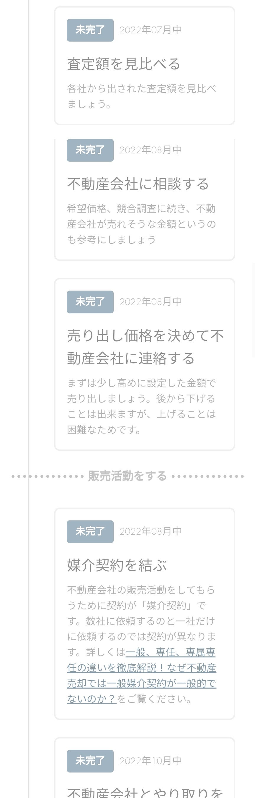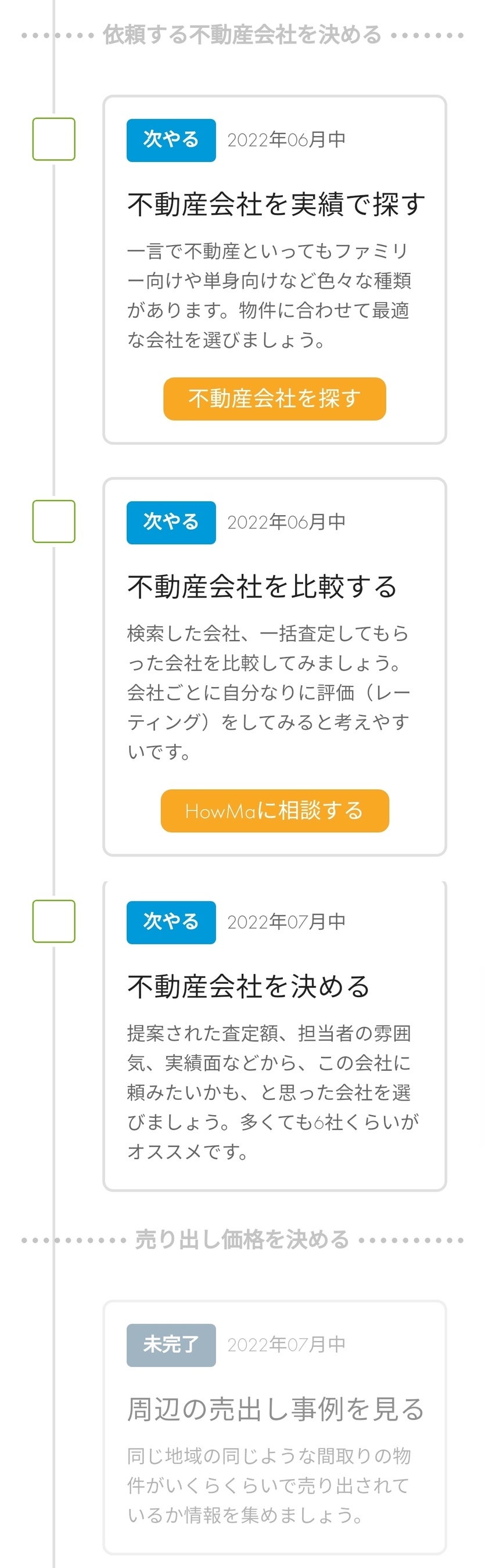 ユーザーそれぞれの売却希望時期に合わせ、プログラムが売却に必要な行動を期日とともに提示します。スケジュールに沿って活動していくだけで、売却期間の延長や売り逃しを防ぎます。