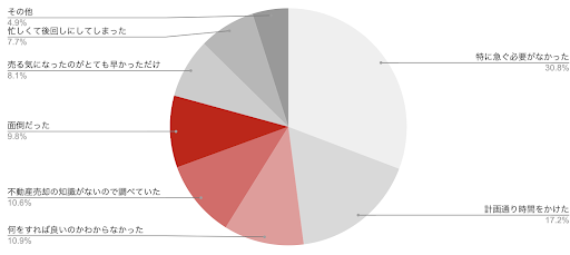 不動産を売却したいと考えてから情報収集や不動産会社を訪問するなどの行動に移すまでに半年以上かかった理由として、「特に急ぐ必要がなかった」「知識がないので調べていた」「何をすれば良いのかわからなかった」「面倒だった」などが上位に上がりました。