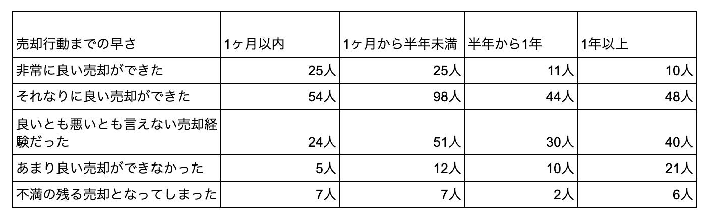 売却の満足度と売却行動までの早さのクロス分析から、不動産売却に対する満足度の高さと動き出しまでの早さには相関が見られます。動き出しが早いほど「非常にいい売却ができたと思う」の割合が上がり、動き出しまでの期間が長くなるほど「あまり良い売却ができなかった」の割合が上がっています。