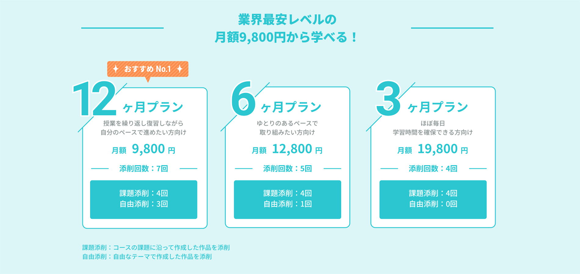 12ヶ月プラン:月額 9,800円 添削回数7回(課題添削:4回/自由添削:3回)★おすすめNo.1!