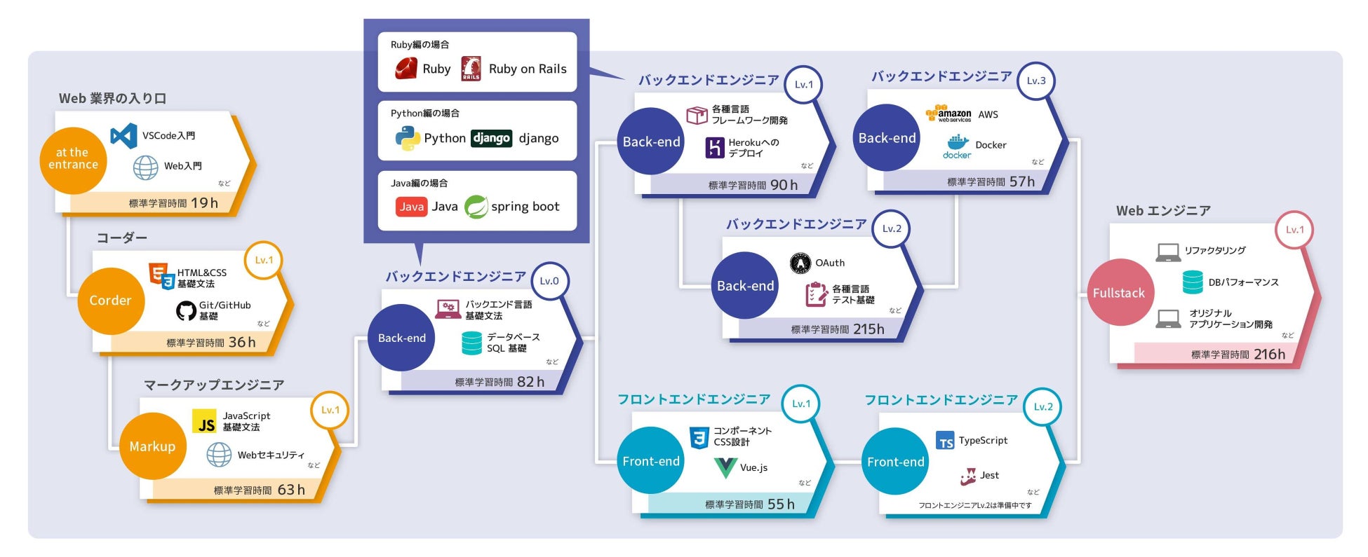 Webエンジニア職を目指したい方が、具体的な業務内容や未来の自分の姿をイメージしながら、自分が身につけるべきスキルをロードマップに沿って学習・習得できるコースとなっています。