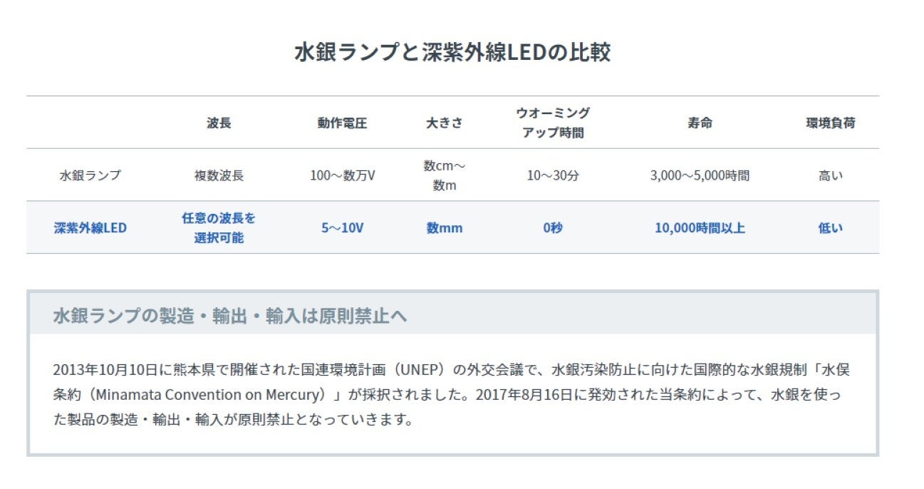 従来、水や空気の除菌には水銀ランプが使われてきました。しかし、水銀は人体や環境へ影響を与えることから「水俣条約」で2020年を目途に制限されることになりました。そこで注目を集めるようになったのが、「深紫外線LED」です。深紫外線LEDは環境への影響も軽微なうえに、コンパクトで省エネ・長寿命という特長を持っています。