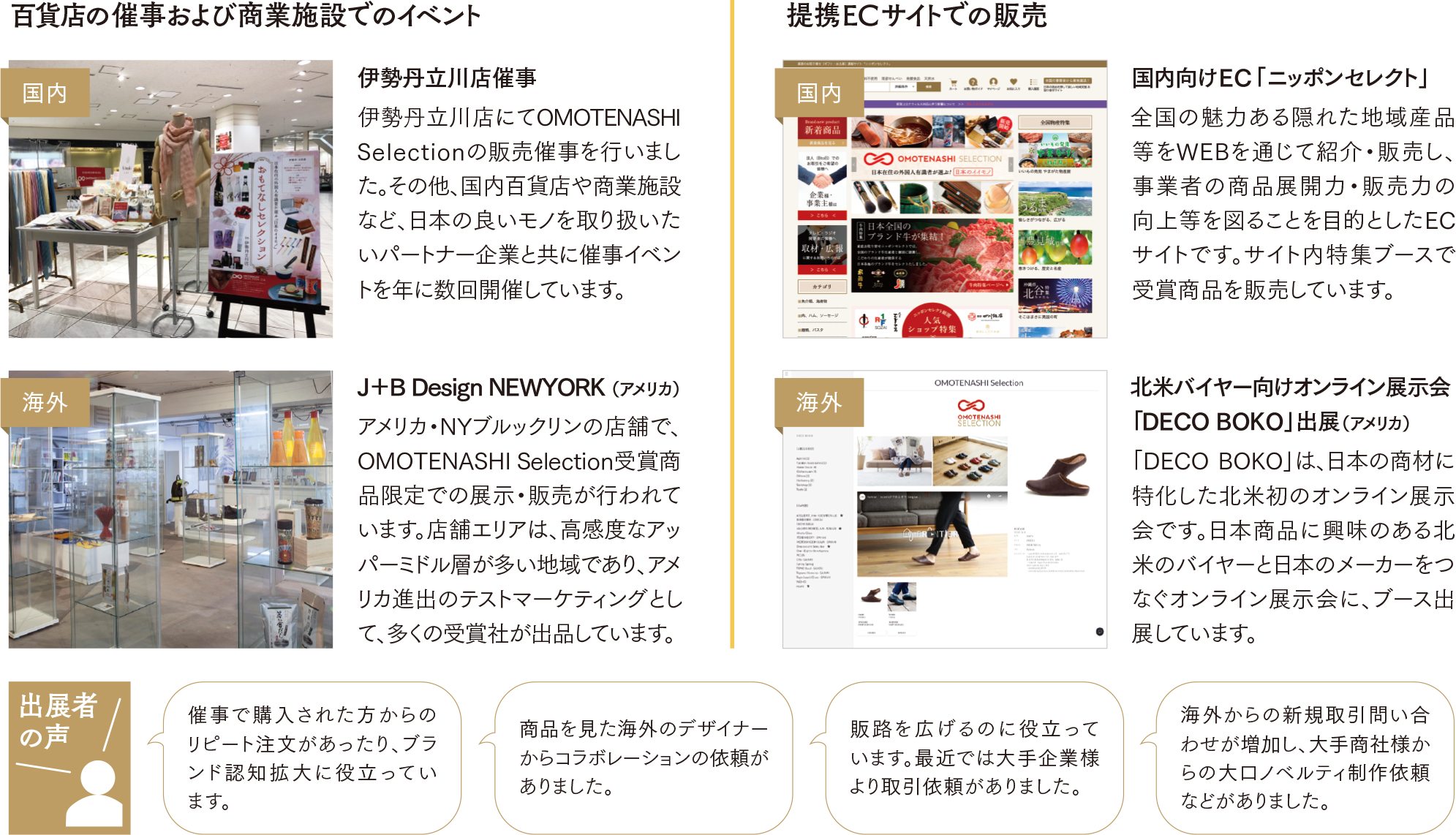 国内・国外の百貨店、展示施設および提携ECサイトでの販売支援など、年間を通じてパートナー企業と連携した施策を企画し、参加事業者を募集しています。過去の実績など、詳しくは「OMOTENASHI Selection これまでの活動実績」のセクションをご覧ください。